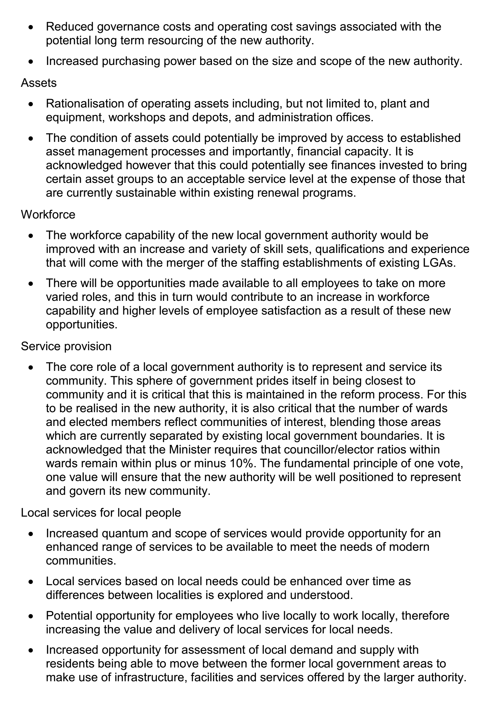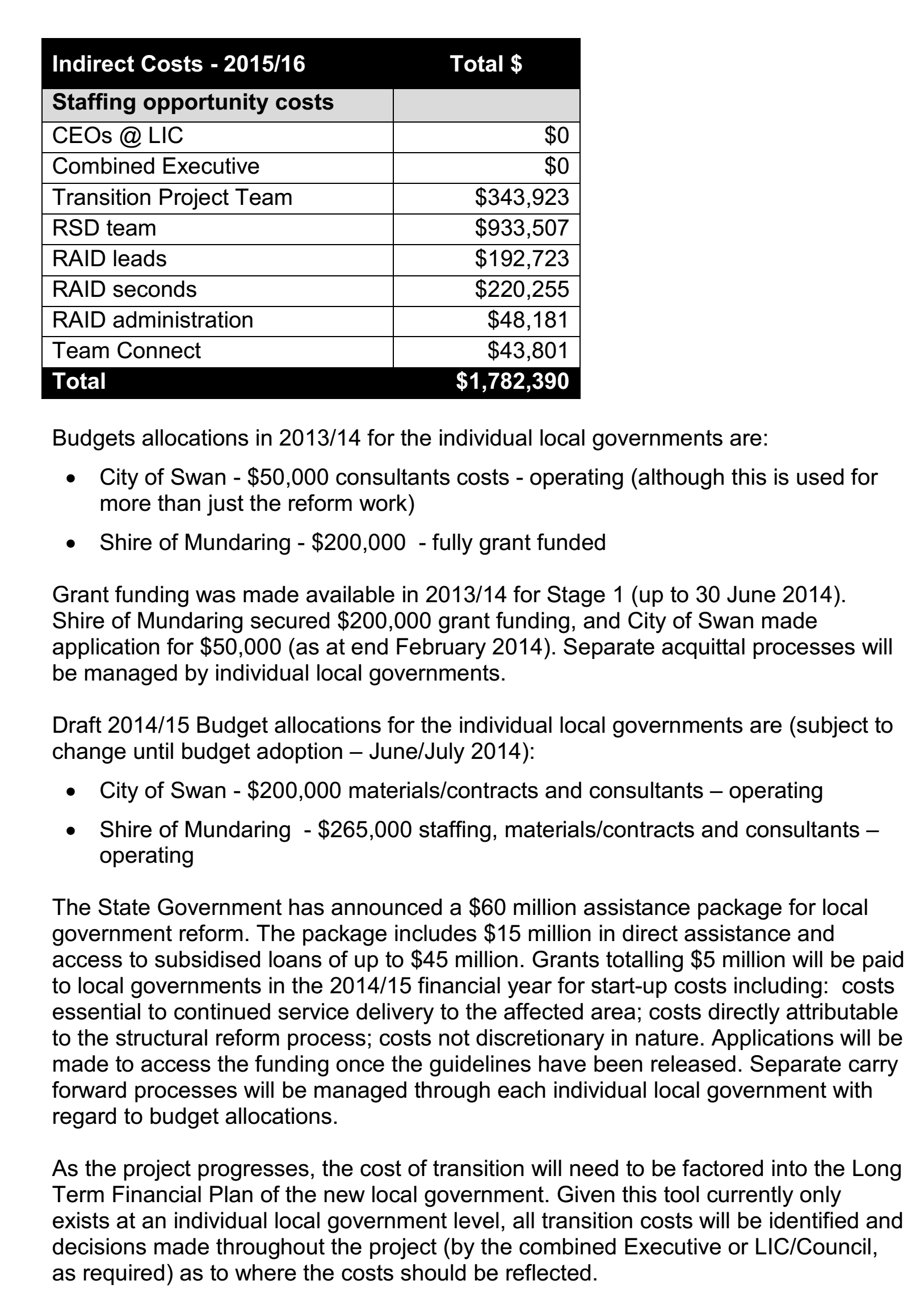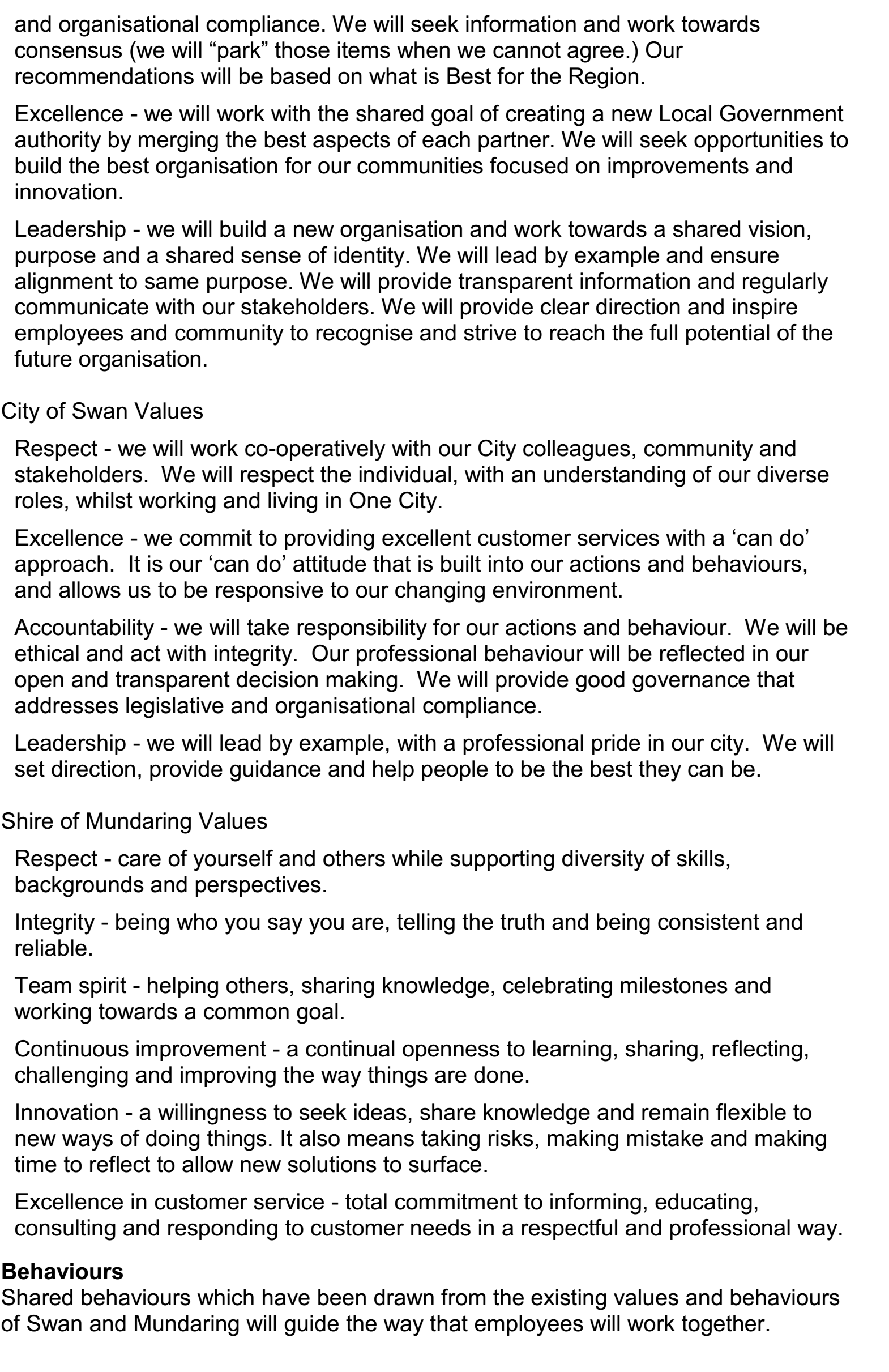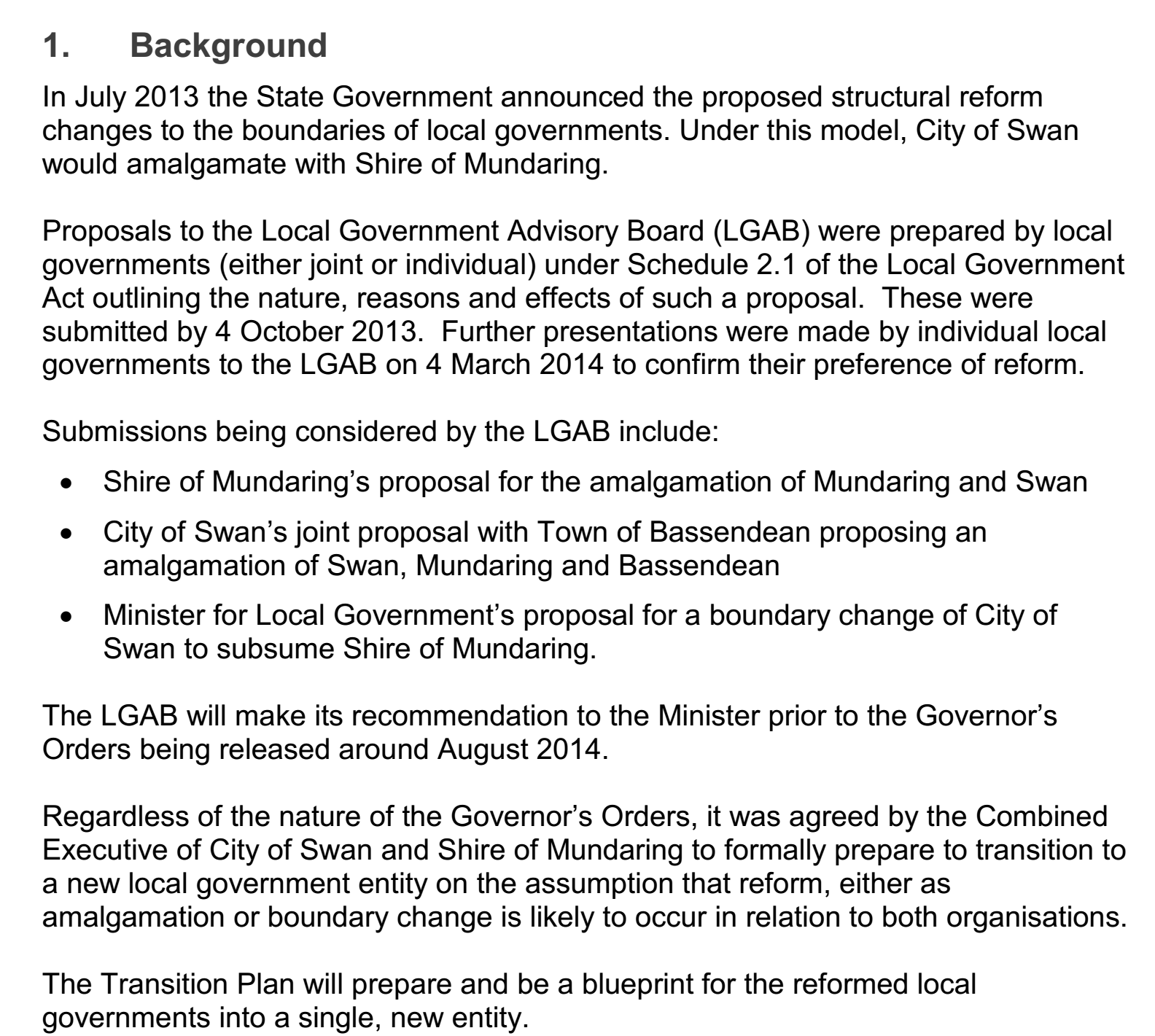 In 2013, the State Government made an announcement that local government should conduct structural reform to change the boundaries of the governments. Under this model, City of Swan will amalgamate with Shire of Mundaring. Following this move, the local government of the City of Swan prepared proposals to the Local Government Advisory (LGAB) under the Schedule 2.1, outlining the nature, reasons and effects of the proposals. These proposals have been submitted in October 2013. In the following months, further presentations have been made by individual local government to the LGBA to confirm their preference of the reform. Main issues mentioned in the proposals include “Shire of Mundaring’s proposal for the amalgamation of Mundaring and Swan”, “City of Swan’s joint proposal with Town of Bassendean proposing an amalgamation of Swan, Mundaring and Bassendean” and “Minister for Local Government’s proposal for a boundary change of City of Swan to subsume Shire of Mundaring”.