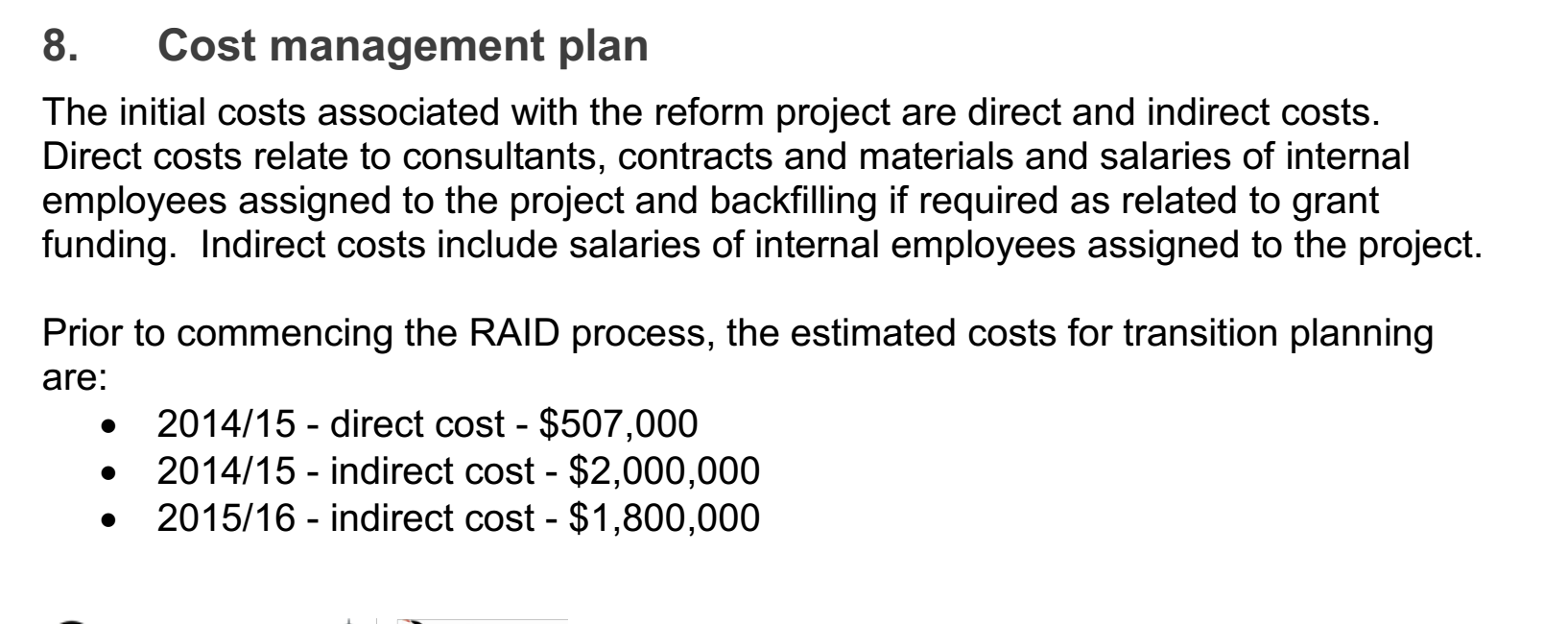 In the chosen PMP, as is shown in Appendix, cost management is a significant content. Drawing on the review of relevant literature about this PMP content, it is argued that the project team of Swan Mundaring Reform Project Management Plan estimate and manage cost with a “bottom up” methodology. In this PMP, it is mentioned that the initial costs of the project include direct and indirect costs. To have a good command of the specific cost items in the two broad categories, manager of this project further breaks down the direct costs into consultants, contracts and materials. Similarly, under indirect cost, there are salaries of internal employees assigned to the project. As is indicated in the tables of cost management, manager of this PMP further divides the direct and indirect cost items into more detailed sections. For example, under HR consultancy, there are employment condition review and IR$ER review. By adding these separate estimates of costs together, the project team has a command of the overall cost of this project. It is argued that the cost management of the chosen PMP is largely operational, since it clearly estimates the amount required by each functional department and each project activity, which also outline an approximate number for cost requirement, shedding light on the project team about funding and budgeting.