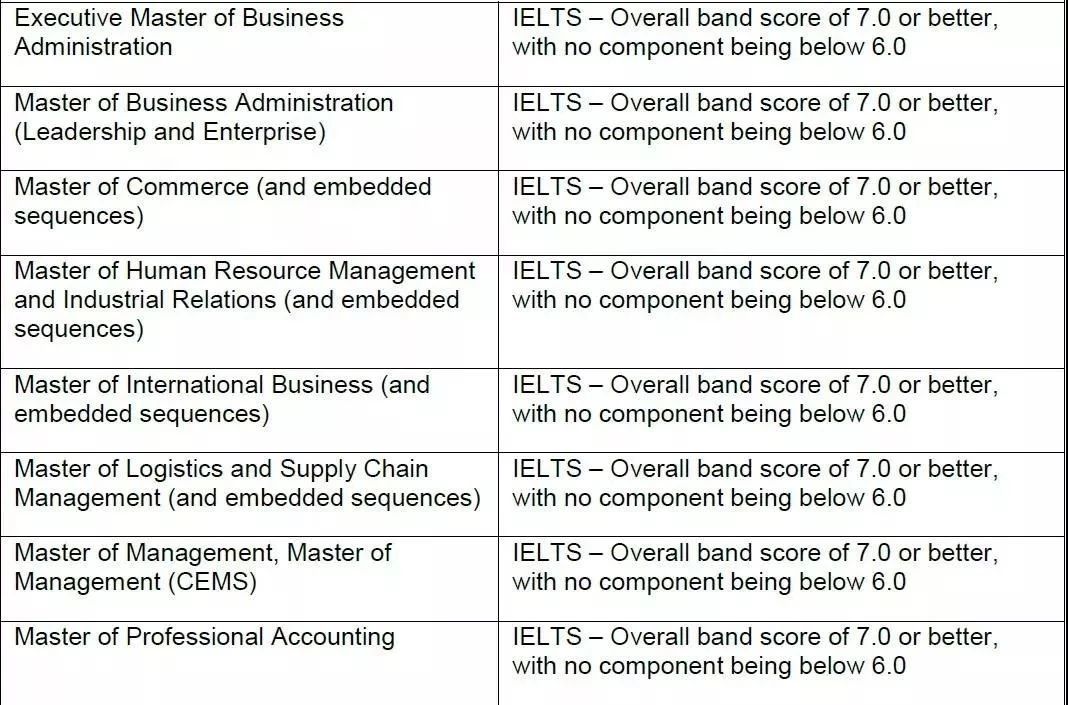 悉尼大學(xué)絕大多數(shù)專業(yè)都要求雅思總分7.0,各個單項(xiàng)不低于6.0,以商學(xué)院為例,商科碩士課程清一色的要求雅思7.0。