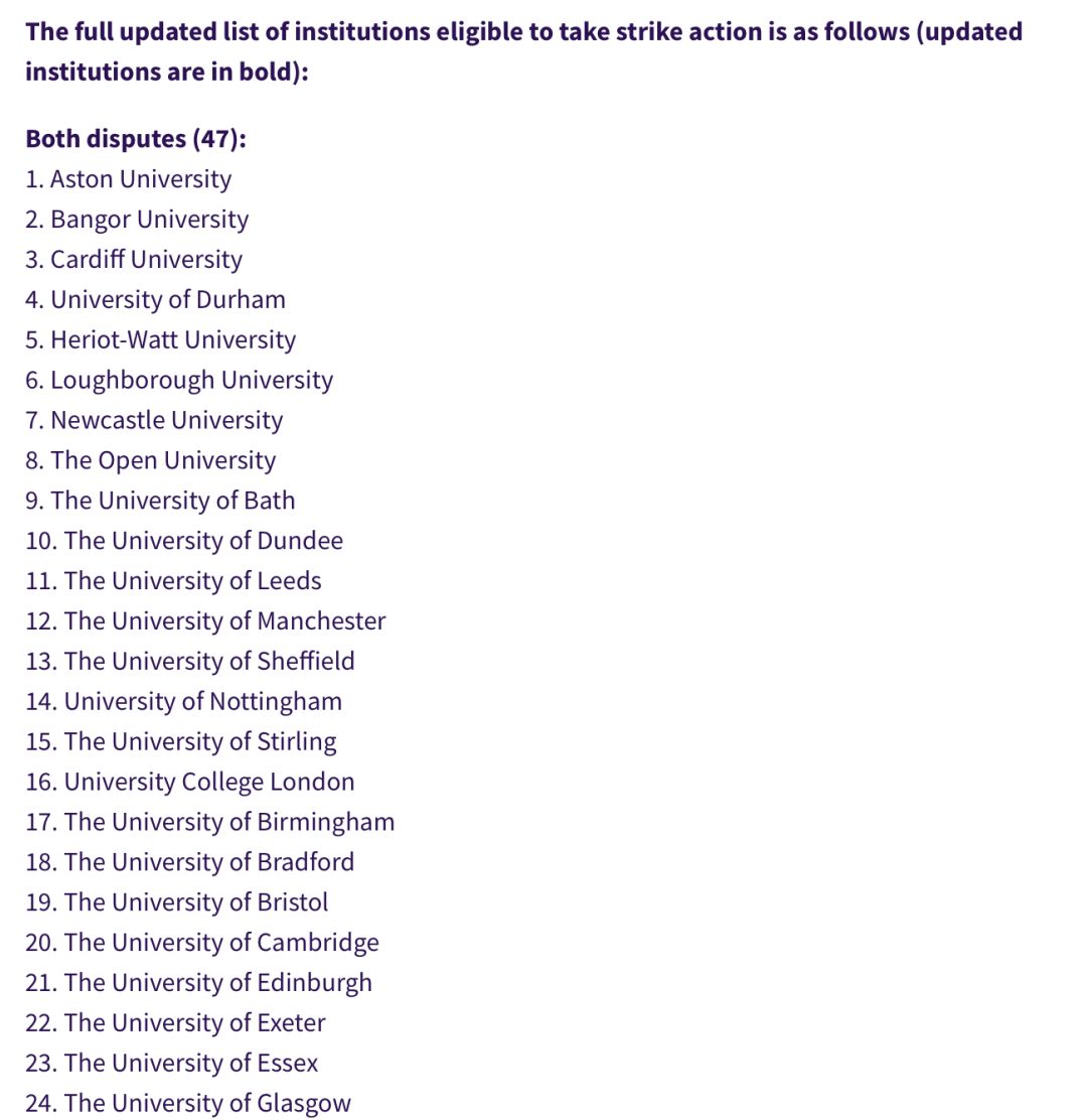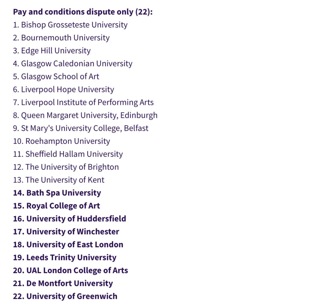 本次罷工活動為期4周、總計14天,其中包括了牛津、劍橋、帝國理工、UCL、KCL、曼大、謝菲爾德、愛丁堡等在內(nèi)的74所英國大學(xué)!『其他參與罷工的學(xué)校名單見文末』