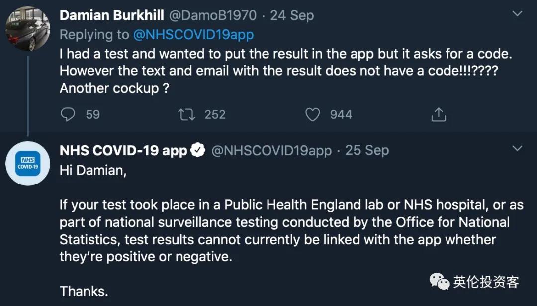 NHS Covid 19回復(fù)稱:“嗨,Damian,如果你的結(jié)果來自英格蘭公共衛(wèi)生實(shí)驗(yàn)室、NHS醫(yī)院或者是國(guó)家統(tǒng)計(jì)局進(jìn)行的檢測(cè),那么測(cè)試結(jié)果目前還無法輸入這個(gè)APP,無論是陽性還是陰性。謝謝?!?
