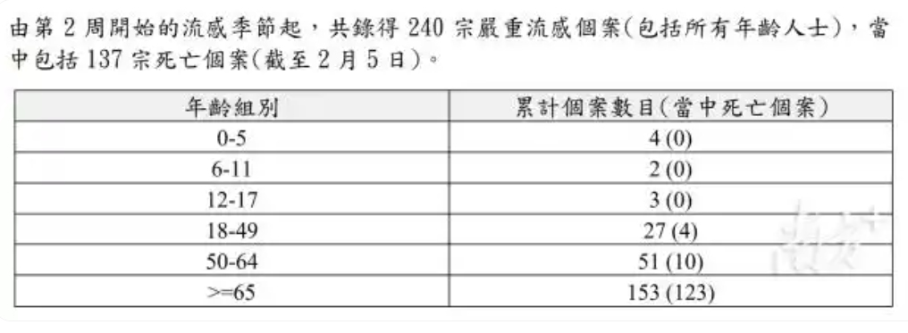 數(shù)據(jù)顯示,自1月5日至2月5日,香港累計240宗嚴重流感個案,其中死亡個案多集中在老年人群體。65歲以上的死亡個案占123宗,而在有臨床資料的成人死亡個案中,約81%的患者本身患有慢性疾病。