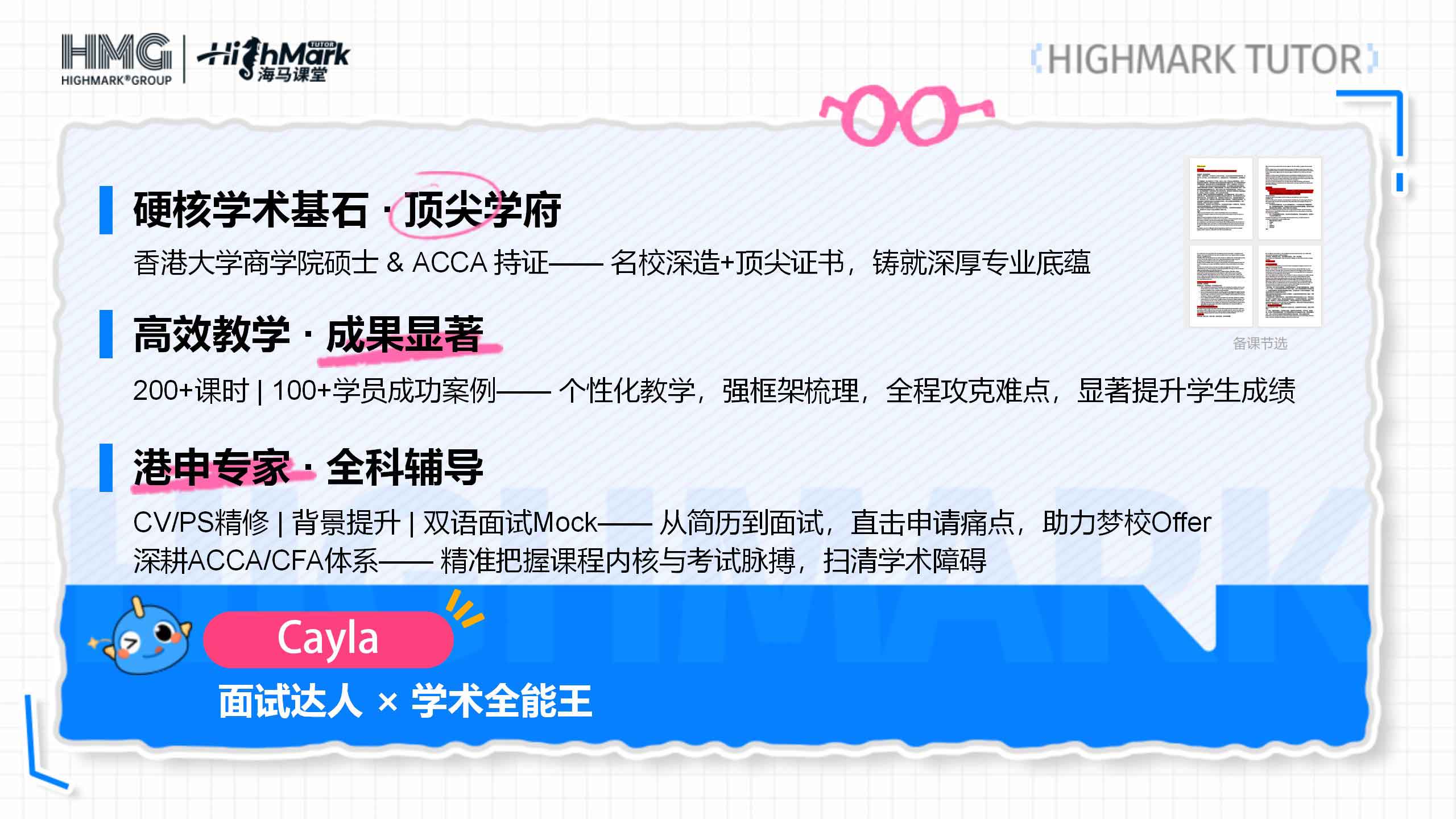 專業(yè)背景:香港大學商學院碩士,持ACCA資格證,理論專業(yè)度+實操能力雙強。