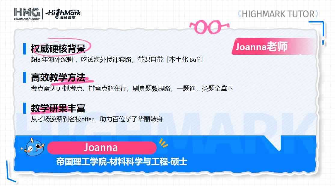 教學(xué)優(yōu)勢(shì):本碩均就讀于帝國理工學(xué)院,學(xué)術(shù)功底過硬。注重細(xì)節(jié)打磨與嚴(yán)格把關(guān),能在學(xué)習(xí)的每個(gè)階段提供專業(yè)反饋,并耐心傾聽學(xué)生的學(xué)習(xí)困惑,給予針對(duì)性指導(dǎo)。