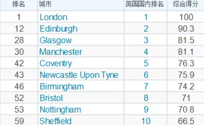 根據(jù)這六大項(xiàng)指標(biāo),算出的2022年英國最佳留學(xué)城市前十名為: