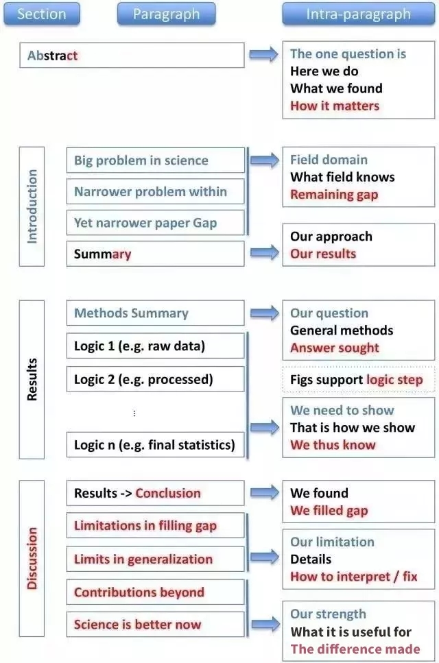 講故事的方法多種多樣,C-C-C 結(jié)構(gòu)作為其中一種,更適用于有耐心、決定花時間理解文章的讀者,但這種結(jié)構(gòu)對沒有耐心的讀者并不友善。好在當(dāng)代科學(xué)文章的結(jié)構(gòu)解決了這樣的問題,標(biāo)題與摘要使讀者可以快速了解文章內(nèi)容。因此,看完引言的讀者很可能會被吸引,并有著足夠的耐心繼續(xù)閱讀文章。而且,過于注重 “內(nèi)容優(yōu)先” 的科學(xué)論文還會產(chǎn)生另一個風(fēng)險(xiǎn):讀者在閱讀過程中會忽視一些段落,這些段落可能是鞏固文章可信度的重要部分,從而使他們質(zhì)疑你的文章。因此,我們建議將 C-C-C 結(jié)構(gòu)作為科學(xué)文獻(xiàn)的默認(rèn)結(jié)構(gòu)。