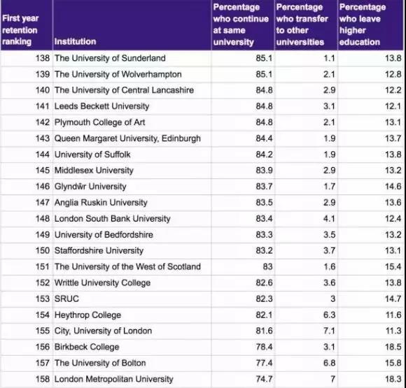 倫敦都市大學(xué)的寶寶們也太慘了吧,每10個(gè)人幾乎就有3個(gè)人不及格。除此之外,該校的轉(zhuǎn)學(xué)率(7%)和輟學(xué)率(18.3%),數(shù)字也是高的驚人。大概因?yàn)榻?jīng)常掛科,不得不轉(zhuǎn)學(xué)或者輟學(xué)吧。