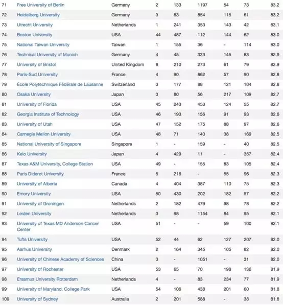 此次排行榜的2,000所高校中,中國共有298所高校入榜,其中中國內(nèi)地高校上榜249所,中國臺灣高校上榜40所,中國香港高校上榜7所以及中國澳門高校上榜2所。