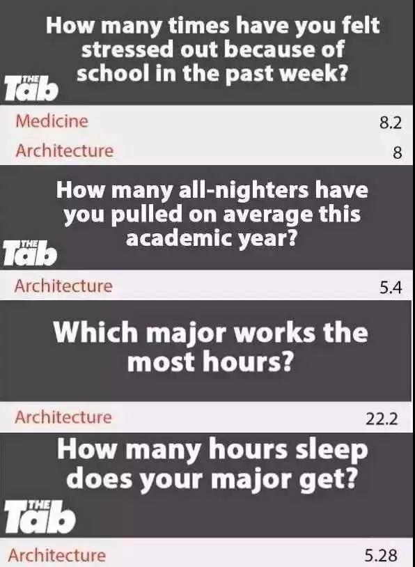 曾經(jīng)有個(gè)網(wǎng)站對(duì)各專(zhuān)業(yè)做過(guò)一個(gè)小調(diào)查,建筑學(xué)憑借一舉之力就“喜獲”以下獎(jiǎng)項(xiàng):